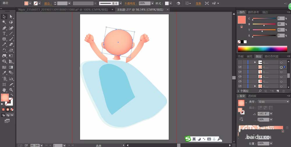 3、用粉色的渐变填充小孩的头部,用不同角度的粉色渐变填充小孩的手臂。