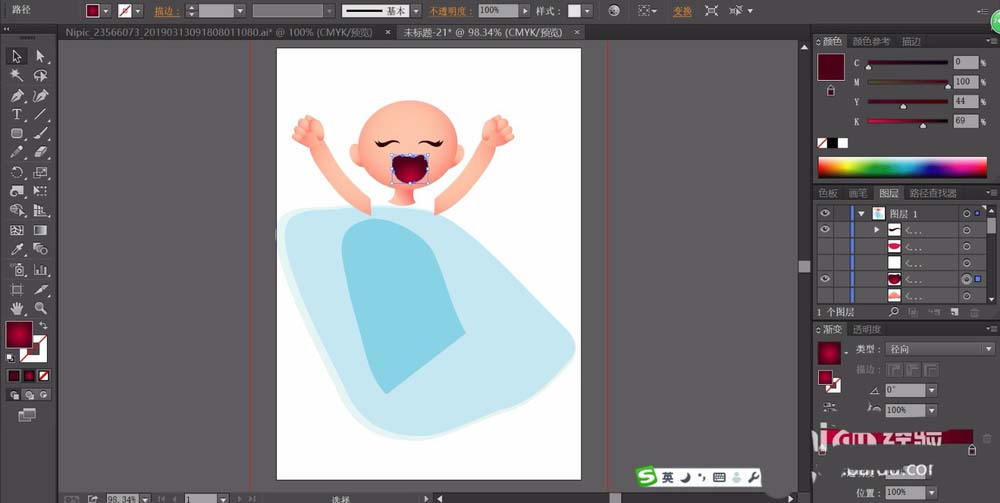 4、用红棕色的渐变填充小孩的嘴巴内部,再用粉红色填充嘴巴内部的下方,用红棕色填充小孩的眼晴。