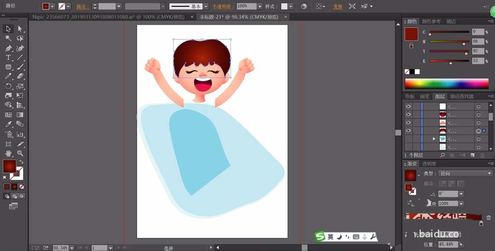 5、使用三个不同的咖啡色设置渐变效果,继续用咖啡色的渐变填充小孩的头发,用白色填充小孩的牙齿。用两种蓝色填充被子的表面,再用灰色与白色搭配填充被子的底部。