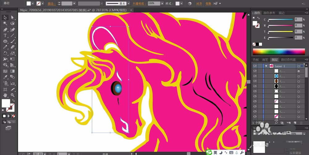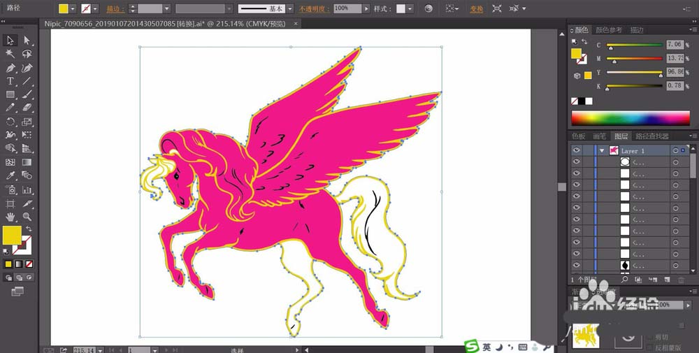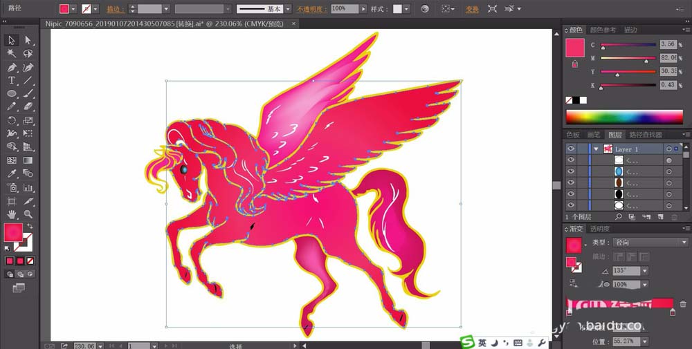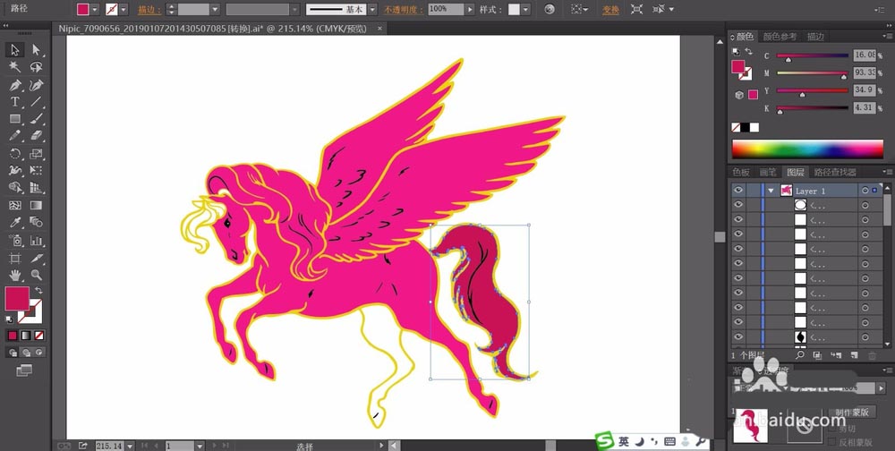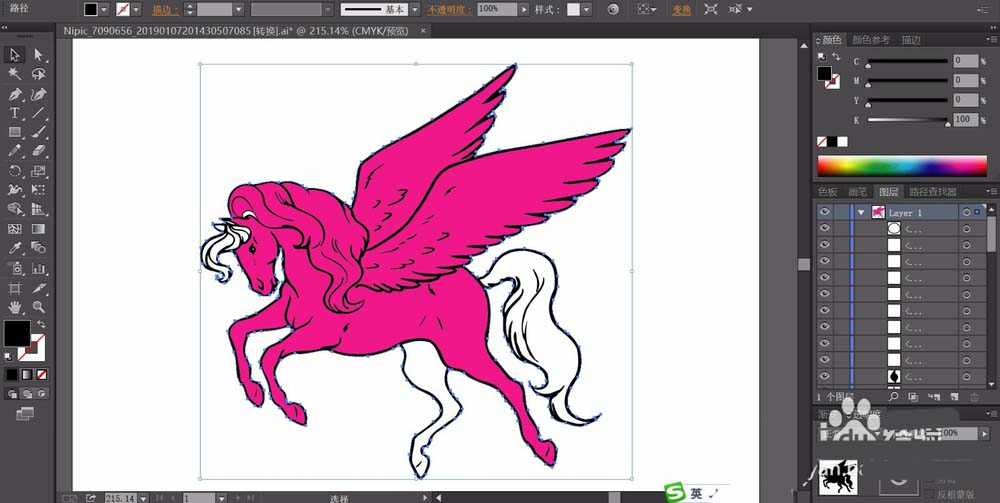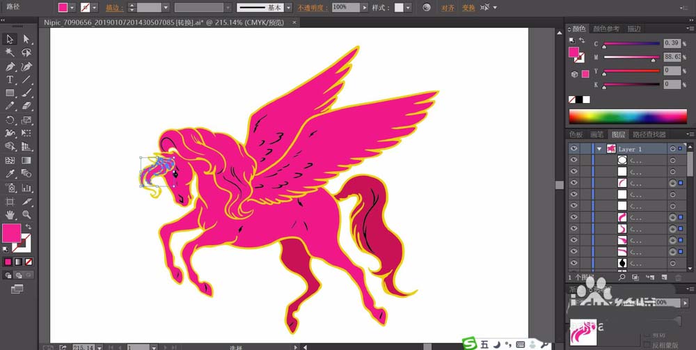 2、用粉红色填充马儿的翅膀与脚的基本路径,让马儿的整体呈现粉红色。