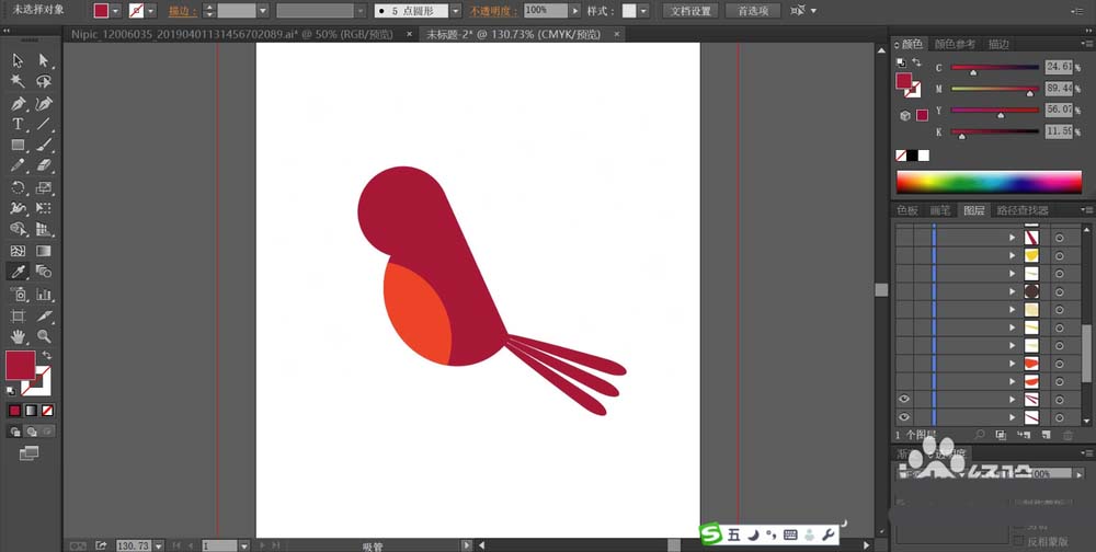 2、我们用橙红色与红色搭配填充雪地鸟的左侧的肚子与右侧的身体尾巴路径。
