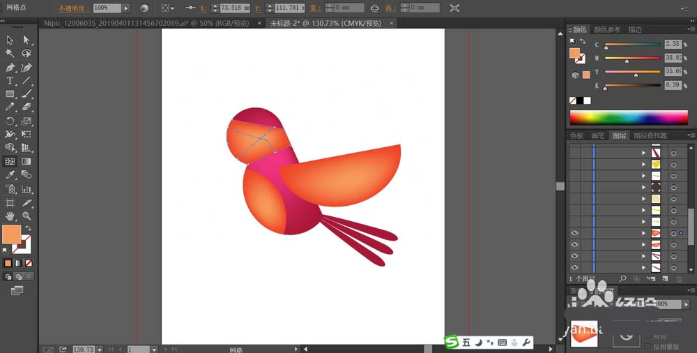 3、使用网格工具给肚子与身体分别做出相似色的渐变效果,再用桔红色的渐变填充翅膀,用桔红色的渐变填充头部的细节元素路径。