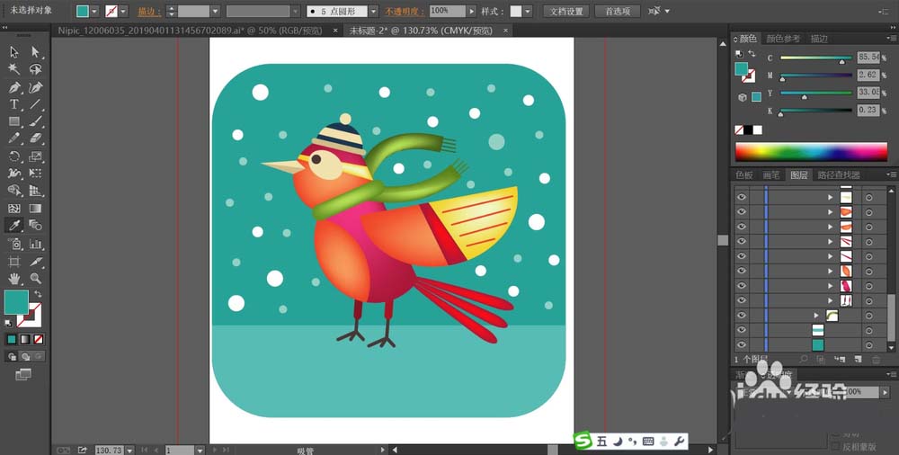 7、最后, 我们用不同明度的青色填充背景的上下结构,再用半透明的白色圆形来呈现满天雪花的效果,完成雪地鸟图片设计。
