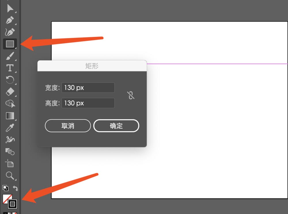 1、打开ai软件,新建文件后选择左边工具栏的矩形工具,关闭填充打开描边,将描边色设置为黑色,在画板上画一个130*130像素的正方形