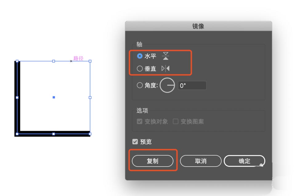 5、在对称的弹出窗中,选择水平的旋转方向,然后点击复制,接着点击确定