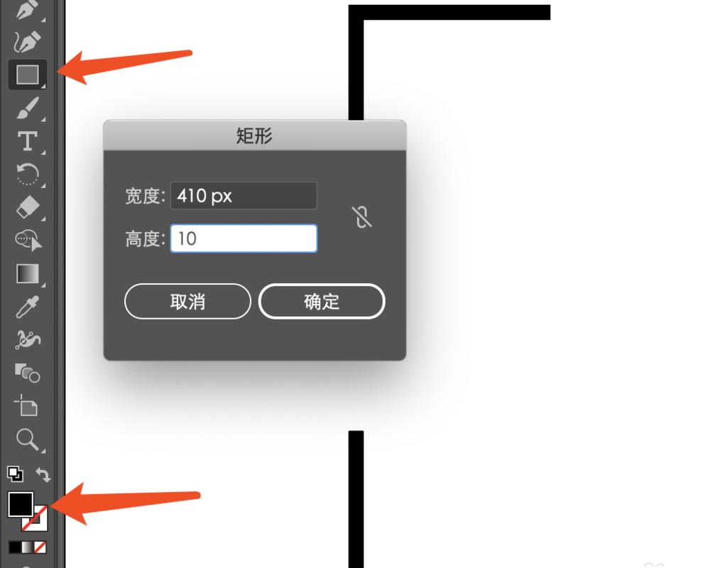 7、如下图所示,接着选择矩形工具,打开填充关闭描边,将填充色设置为黑色,在画板画一个410*10像素的矩形
