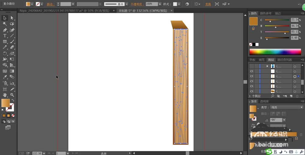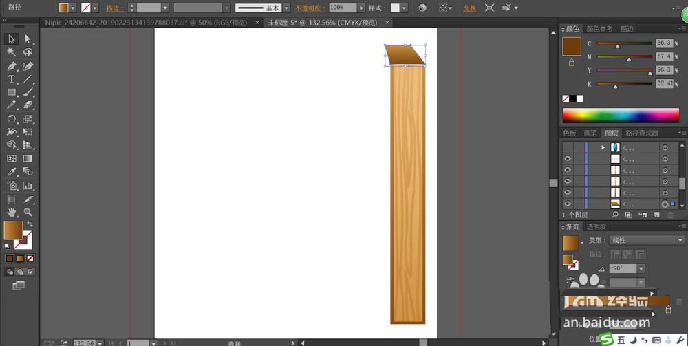 1、先用钢笔工具画出珠算工具的右侧木支架的细节路径,我们用棕灰色的渐变填充木支架的顶端与边缘路径,中间的木纹理路径用淡棕色的渐变填充。