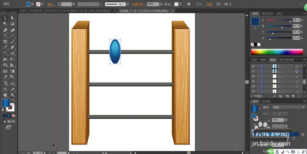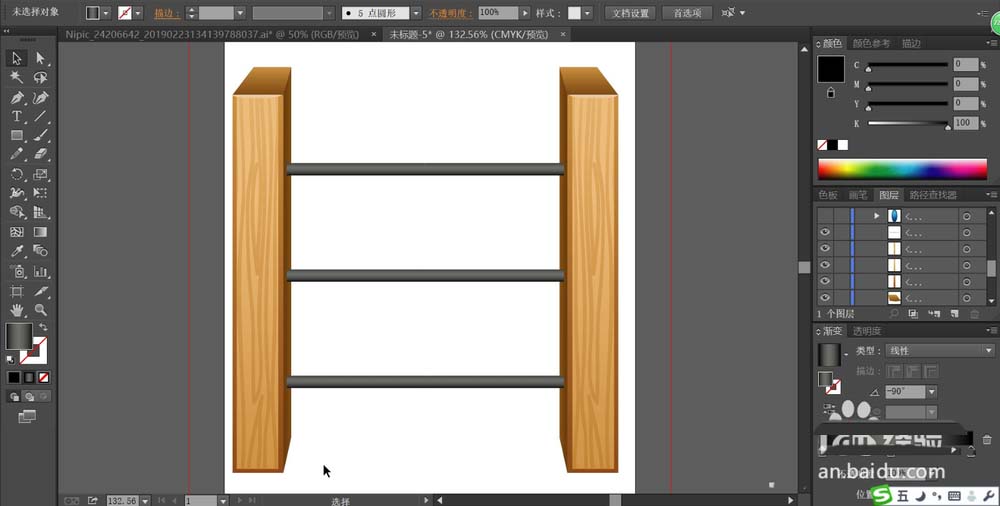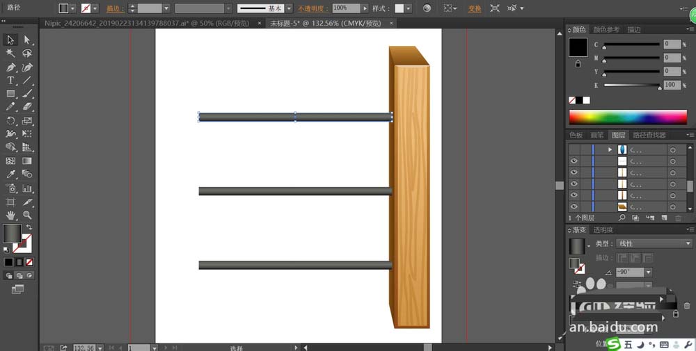 2、使用矩形工具画出木支架上面的金属横条的路径,我们用灰黑色的渐变填充。