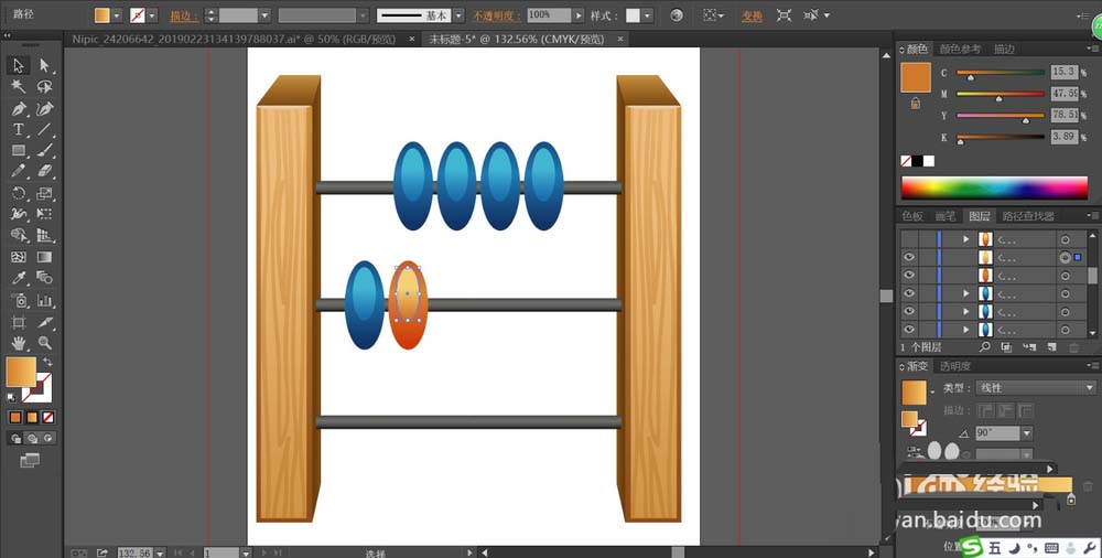 6、继续在支架上面复制橙色的圆珠并让它们水平对齐,我们完成这个珠算素材设计。