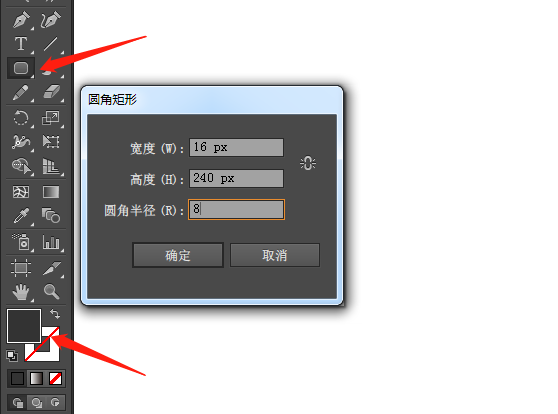 1、打开AI软件,新建文件后选择圆角矩形,打开填充,在画板上画一个16*240,圆角半径为8像素的矩形