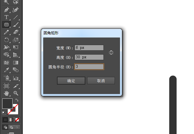2、接着点击圆角矩形工具,打开填充,画一个6*30,圆角半径为3像素的矩形