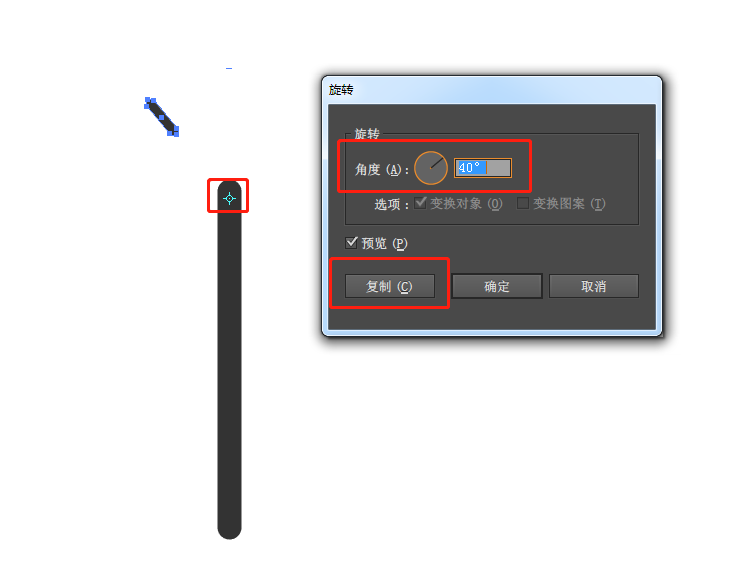 5、在弹出窗中将旋转角度改为40度,点击复制,接着点击确定