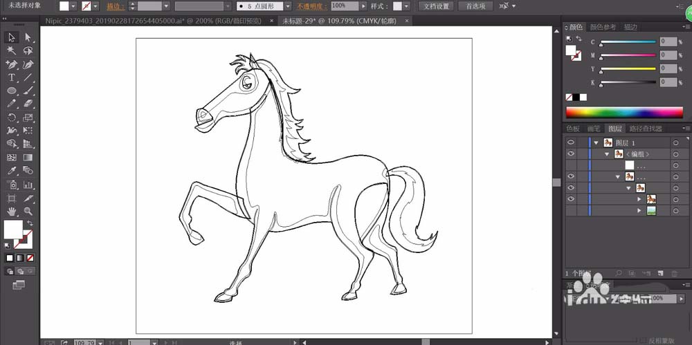 1、先用钢笔画出小马的基本身体轮廓,包括:马头、鬃毛、腿部动作与大大的尾巴等元素的路径。