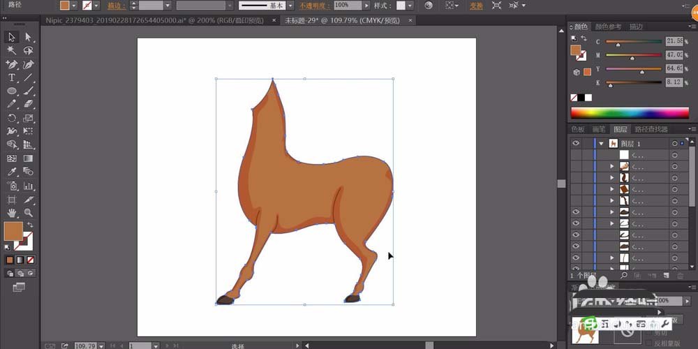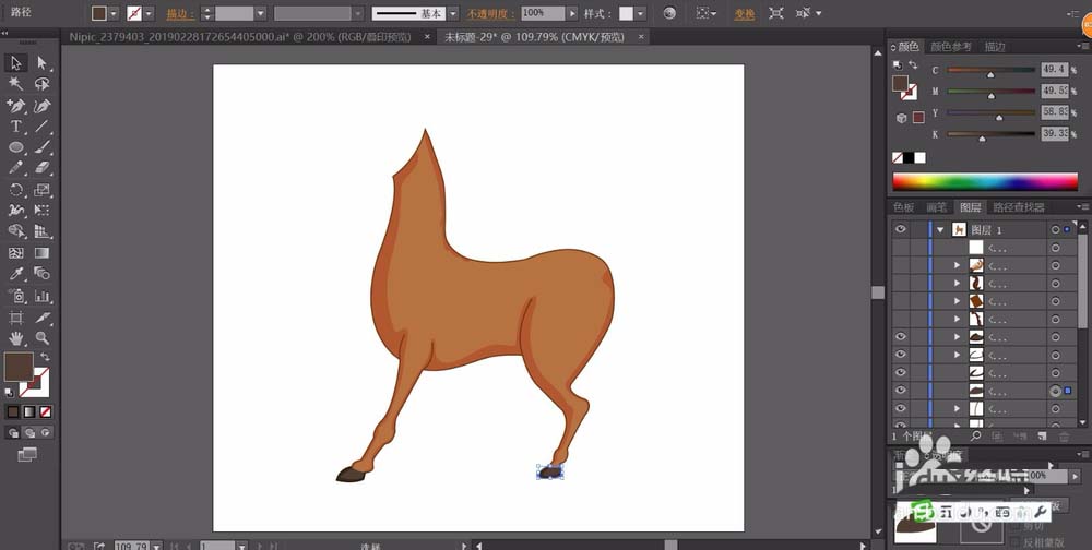 2、我们用明暗两种棕色填充马儿的身体与腿部,让暗色调呈现在左右侧的边缘路径。马蹄用不同明度的灰黑色来填充。