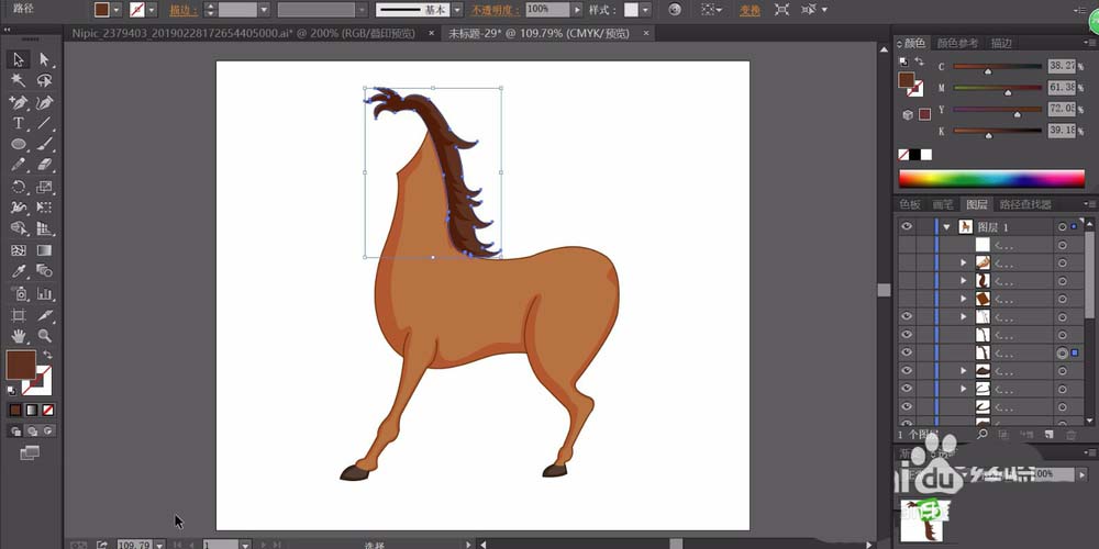 3、这一步,我们用咖啡色填充小马的鬃毛的路径,在右侧边缘填充淡咖啡色。