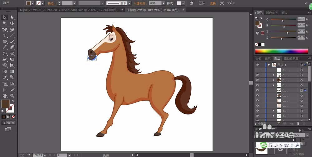 4、接着,我们继续用灰白色与灰黑色搭配填充小马的眼晴,再用青黑色填充小马的嘴巴的路径。小马的尾巴也用咖啡色与淡咖啡色搭配填充。