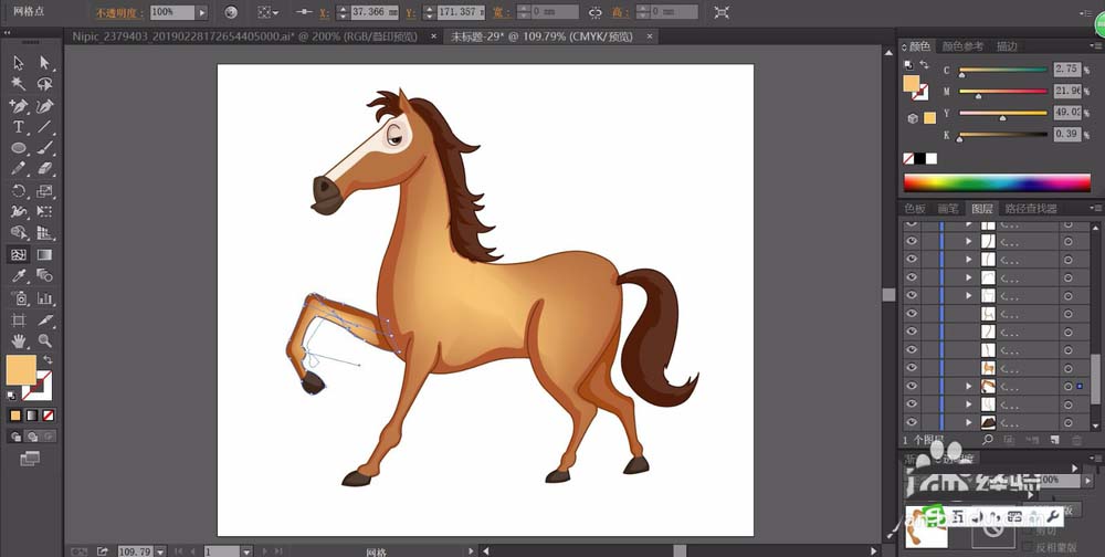 5、用之前相同的办法填充小马的两只腿,完成整个小马的身体填色。我们用网格工具给小马的身体的正面做出棕色到淡黄色的渐变效果,从在加强小马身体的立体感。