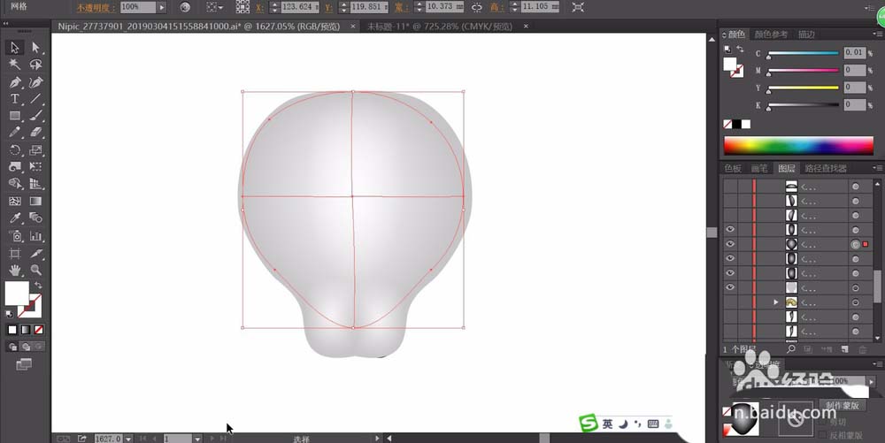 2、用灰白色填充山羊的头部,我们用头部的内部边缘画出高光路径,先用白色填充再用网格工具做出灰白色的渐变,我们设置成滤色模式。在下颚处设置成正片叠底的效果,让暗光呈现在左右两侧。