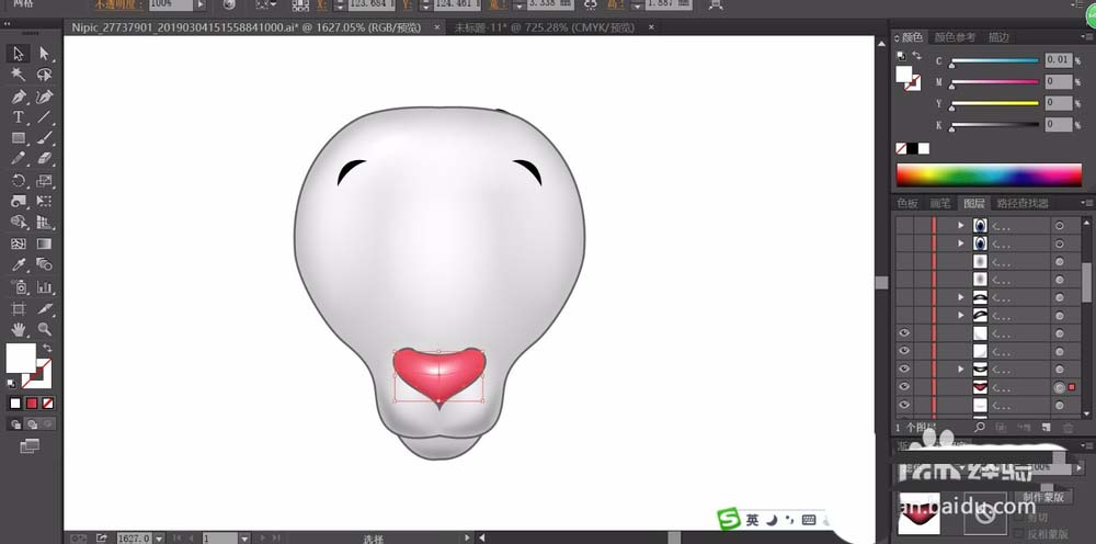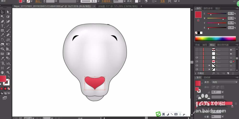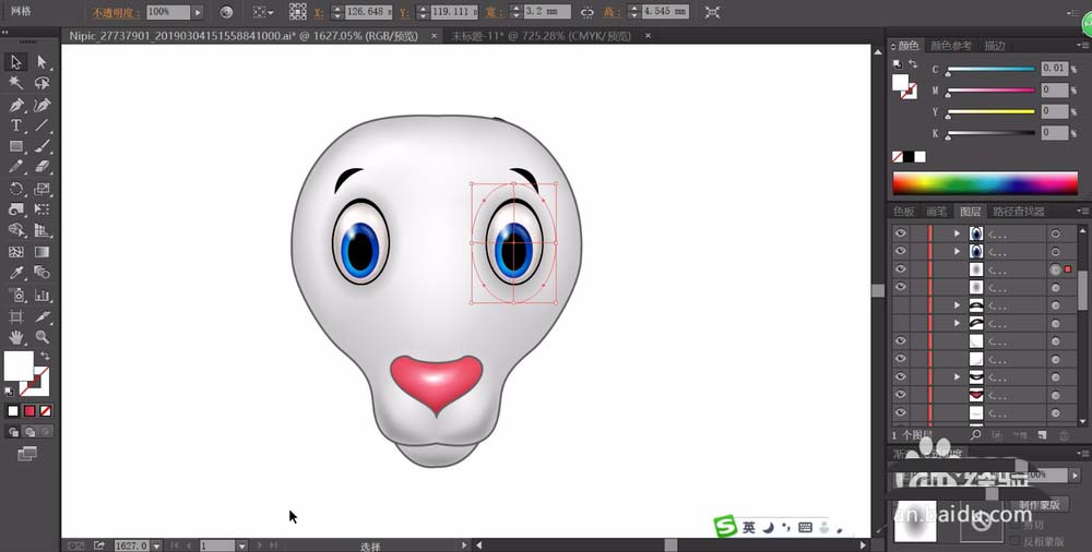 3、再用钢笔画出眼晴上方的眉毛并填充黑色,眼晴区域用灰黑色的渐变填充再设置成正片叠底的模式。嘴巴填充粉红色的渐变效果,再用网格工具做出灰白色的渐变,设置成滤色模式。