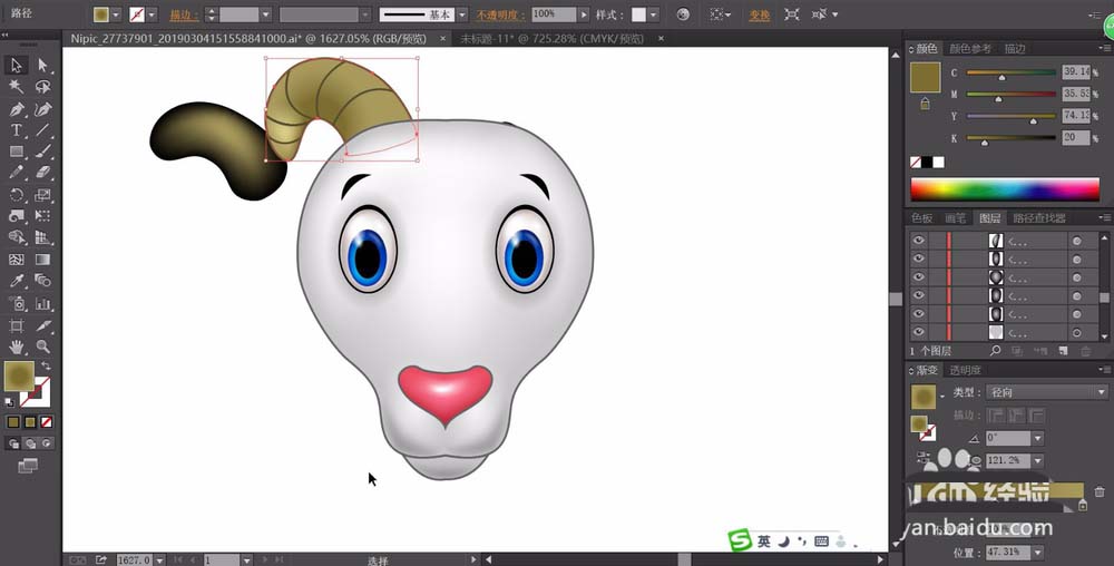 5、接着,我们开始绘制羊角的路径并用茶色的渐变填充,继续复制一下羊角的路径并填充白色,我们设置成滤色模式。用同样的办法绘制出山羊的另外的一只羊角。