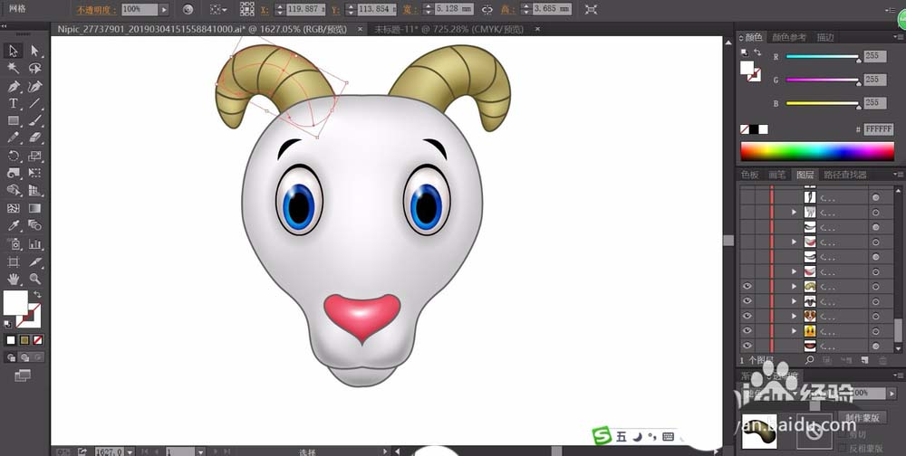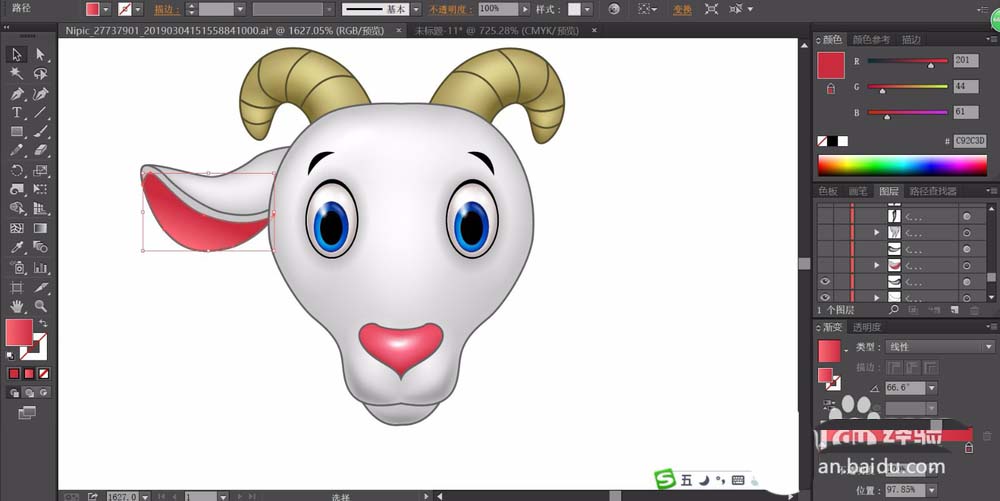 6、这一步,我们绘制出山羊的耳朵的路径,我们用灰白色填充上面外侧,用粉红色的渐变填充耳朵的内部。再使用网格工具绘制出高光的效果在耳朵的上方。山羊的头部右侧也绘制出耳朵。