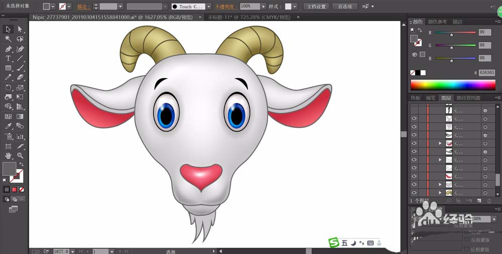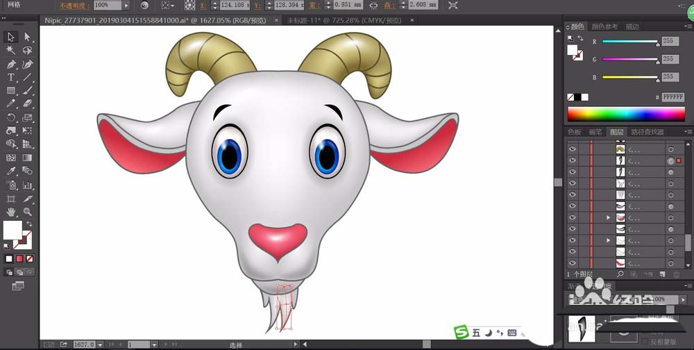 7、最后,我们绘制出山羊的胡须路径并用灰色填充,再通过网格工具做出高光效果,完成山羊头像设计。