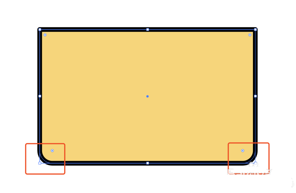 4、选择矩形工具,打开描边关闭填充,画一个矩形,放在矩形右边,用直接选择工具选择上面的两个锚点,修改圆角度为最大,接着选中左下角的锚点,点击dele键删除