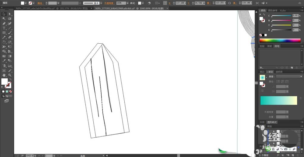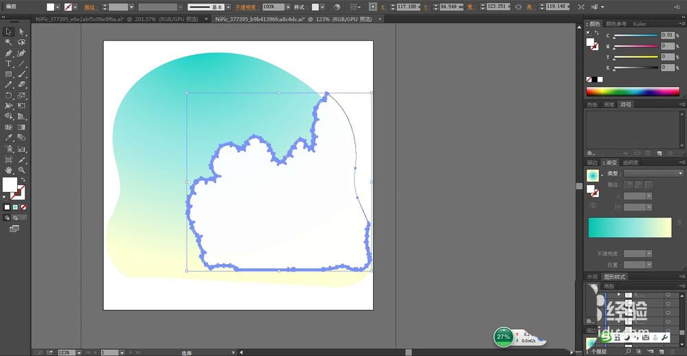 1、先用钢笔勾勒出天空与白云的基本轮廓,我们用青色的渐变填充这个天空,再用灰白色填充这个云朵的路径。