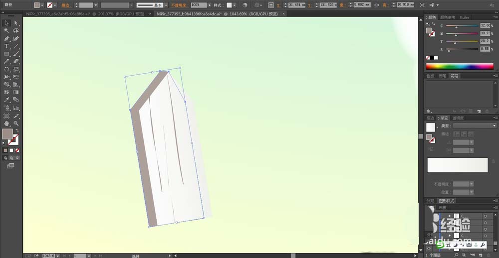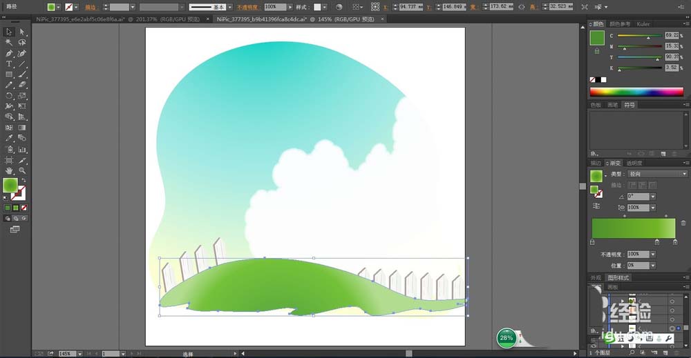 3、复制这个栅栏到西瓜地的左右两侧,改变一下大小与位置与方向,再用绿色的渐变填充这个西瓜地。