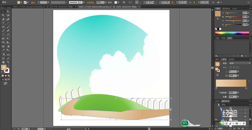 4、我们用钢笔绘制出西瓜田当中的沙地的轮廓,我们用土黄色的渐变填充。