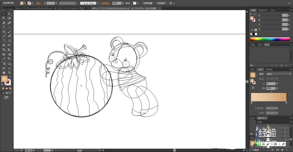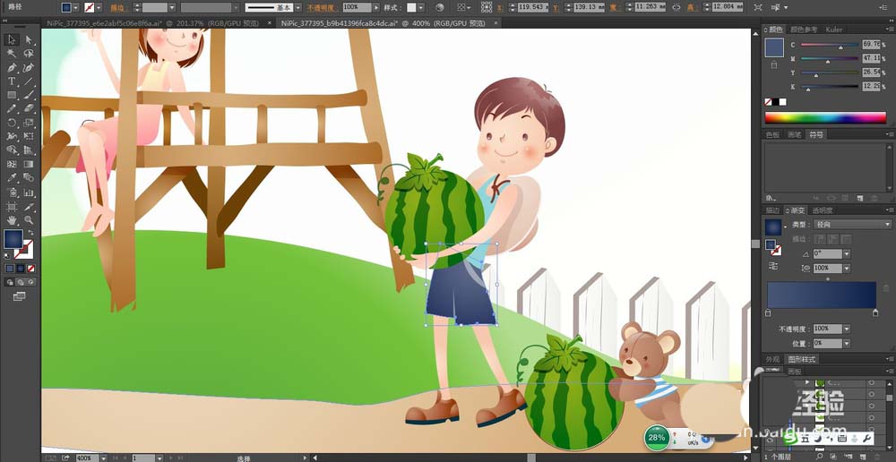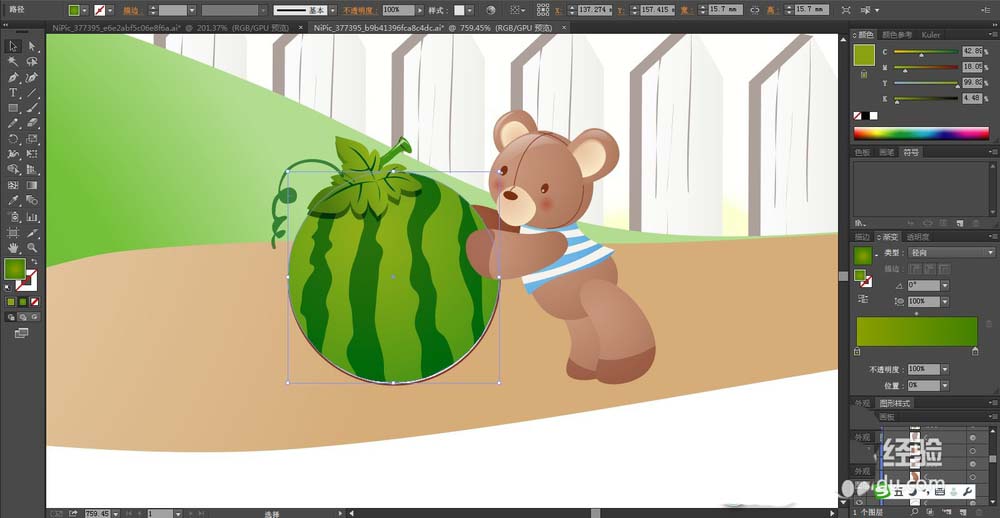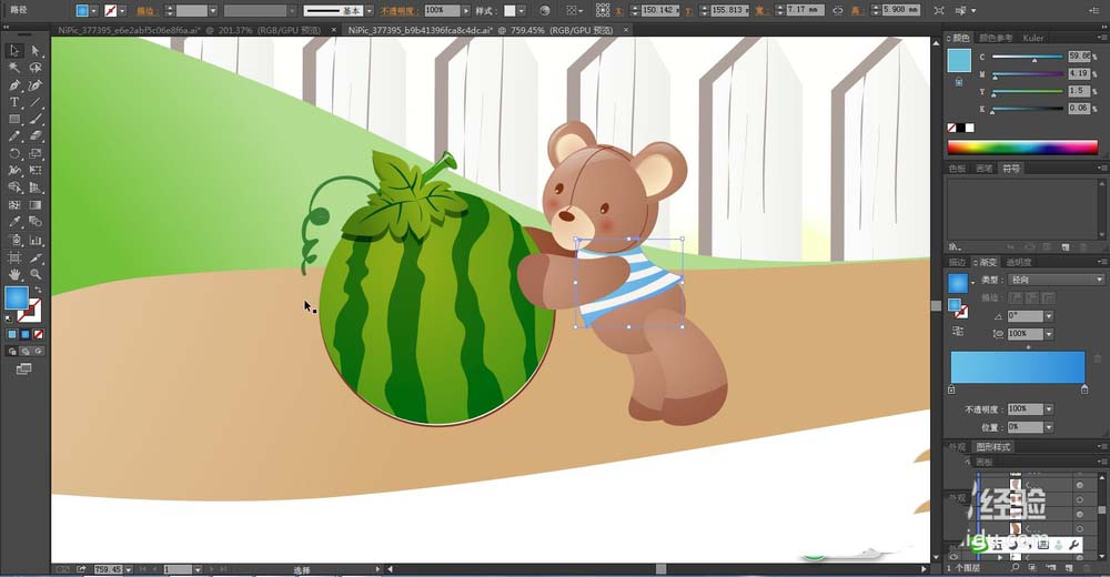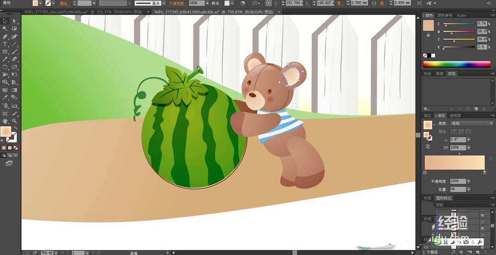 5、在图片的下方绘制出一只小熊推动着一颗大大的西瓜的路径,我们用咖啡色的渐变填充小熊,在衣服上用蓝色的渐变与灰白色搭配填充,在耳朵上用米黄色的渐变填充。