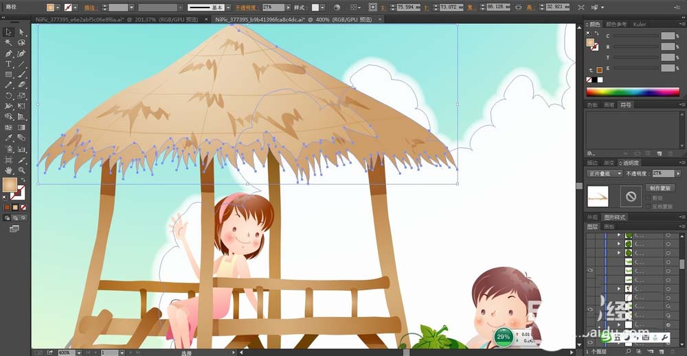 7、这一步,我们再继续绘制出西瓜田里面的一个小小的草亭子,还有一位坐着的女生与一位拿着西瓜的男生的路径。我们用土黄色的渐变填充茅草亭子,在暗光区域用正片叠底的土黄色的渐变填充,在高光区域用滤色的灰黑色的渐变填充。