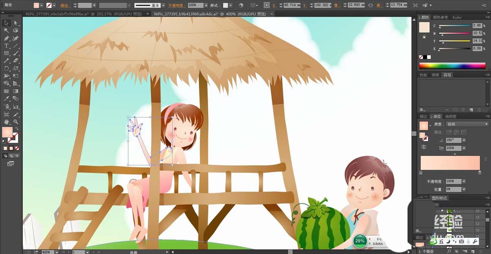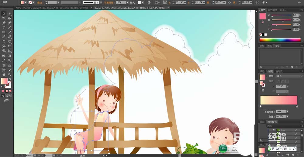8、小女孩的服饰用桃红色到黄色的渐变填充,脸蛋用粉色的渐变,头发用咖啡色的渐变,手臂等皮肤路径都用粉色的渐变填充。