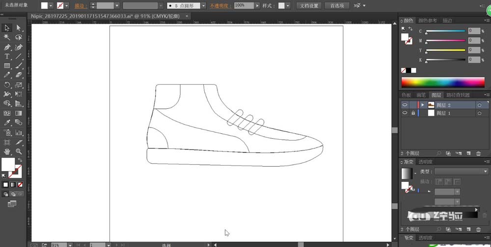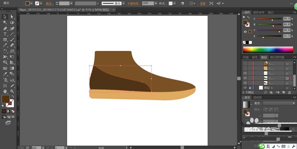 2、我们用暗棕色填充鞋面的轮廓路径,让鞋面的色调保持在较暗的状态。