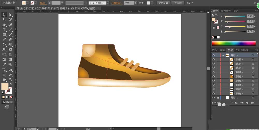 6、最后,我们用土黄色填充鞋带的路径,让其与鞋面的暗褐色形成对比。