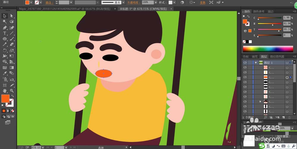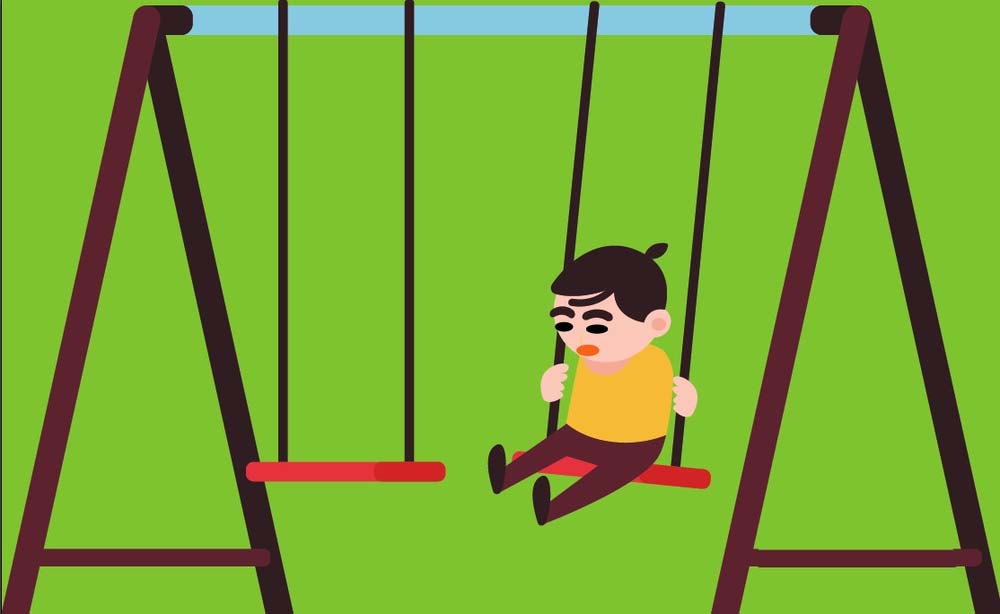 6、最后,我们画出男生的脸蛋表情元素并用灰黑色填充眼眉,再红色填充嘴巴,用橙色填充鼻子,用粉色填充双手,完成荡秋千场景画设计。