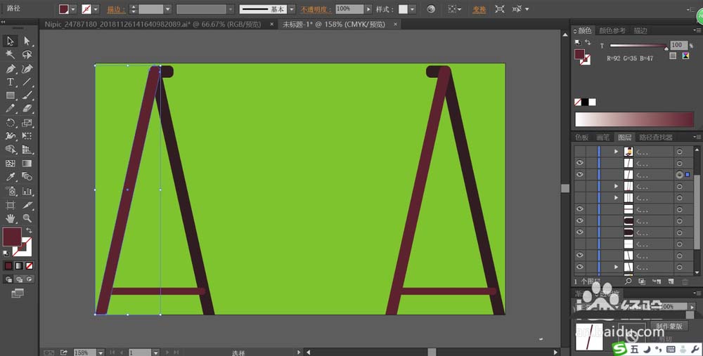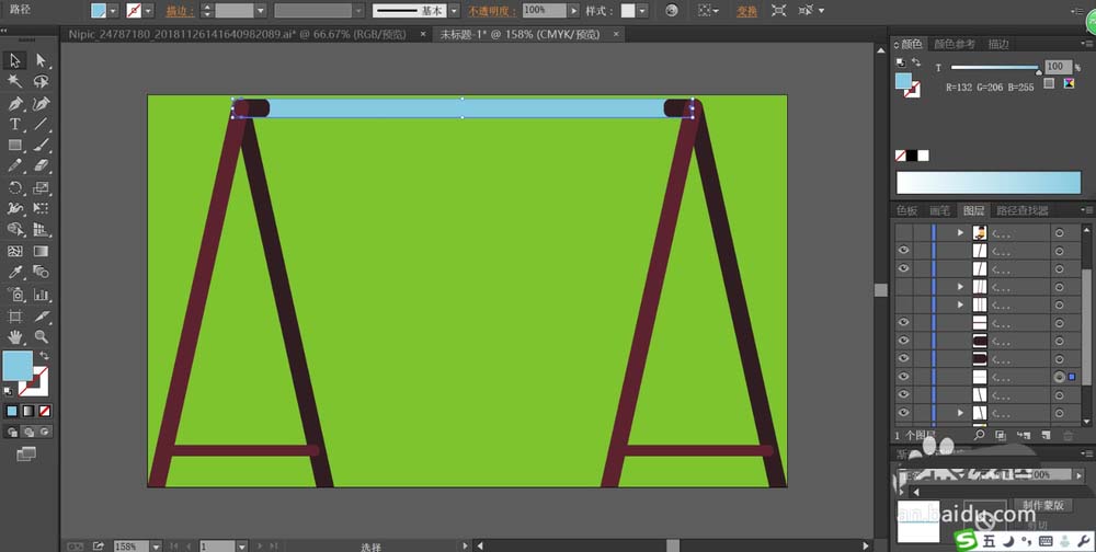 2、用红棕色与灰黑色搭配填充秋千的支架的路径,绘制完成一个之后再复制出另外的一个。
