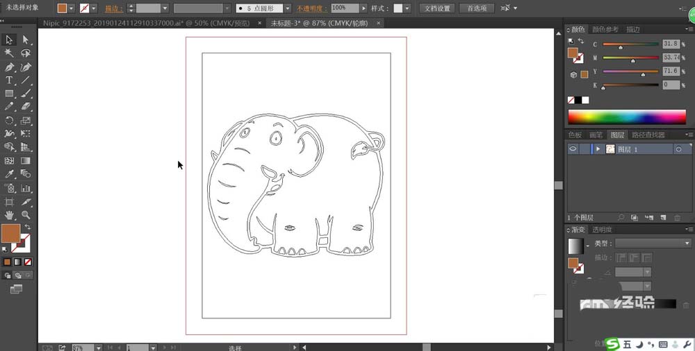 6、填充完成大象的脚趾成为咖啡色,再用红色填充大象的嘴巴内部的路径。