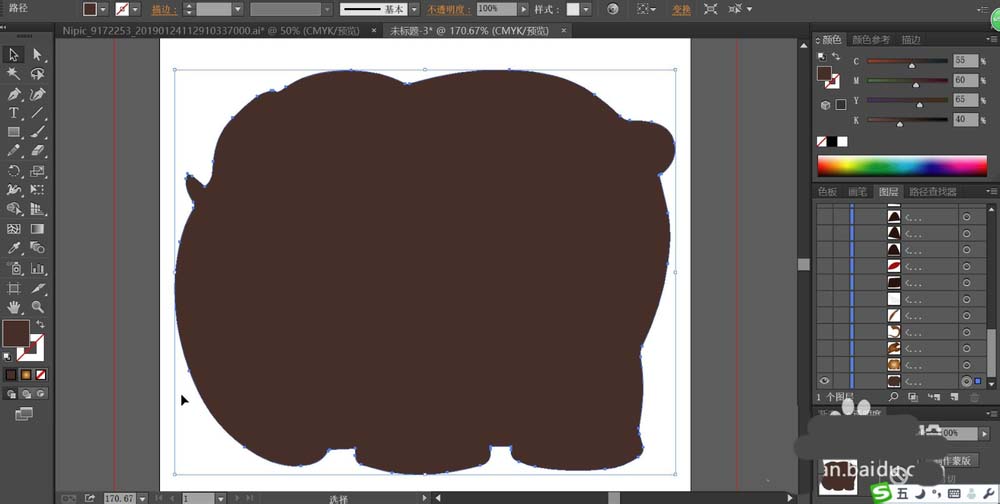 2、用深咖啡色填充大象的基本身体轮廓,让大象的动作呈现出来。