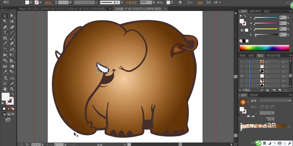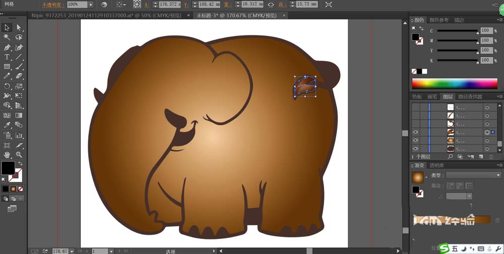 4、用咖啡色填充大象的尾巴,再用网格工具做出咖啡色的渐变效果。