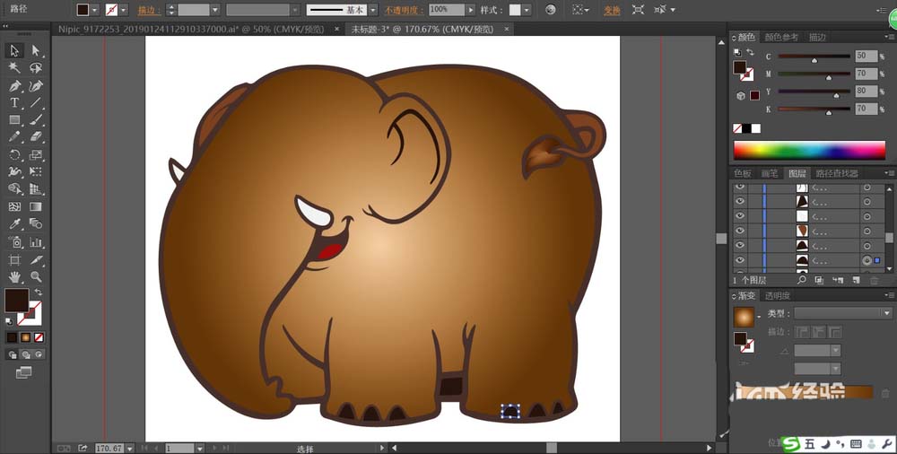 5、再用白色填充大象的牙齿的路径,大象的脚趾的路径填充一个咖啡色。