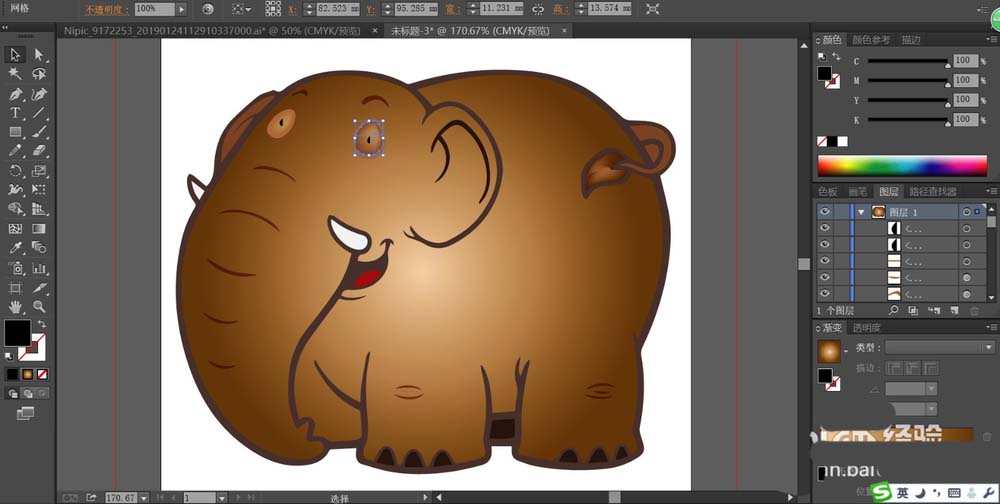 7、接着,我们用淡咖啡色填充眼晴的路径并用网格工具做出立体的效果,眼晴上面的小点填充黑色。身体上面的暗光褶皱用正片叠底的效果的咖啡色填充,完成大象头像设计。