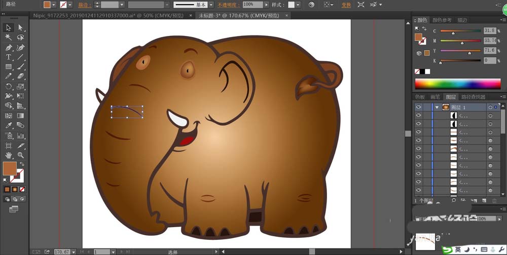 1、先用钢笔画出大象的基本轮廓,再用路径一一呈现出大像的鼻子、眼晴、嘴巴等多个表情元素,以及身体表面的细节元素。