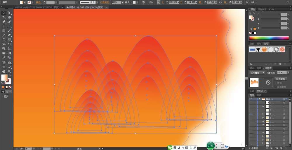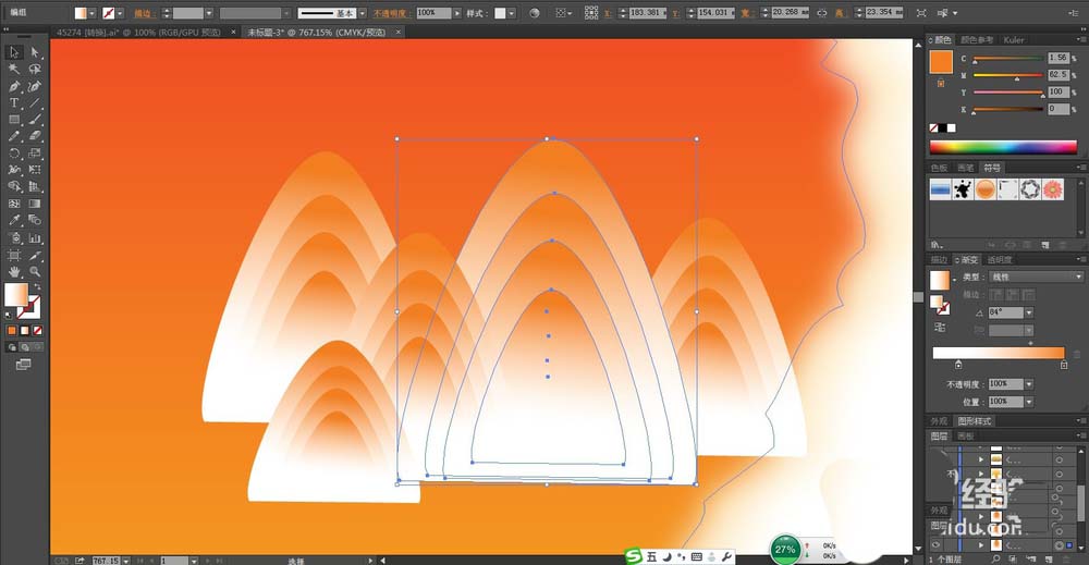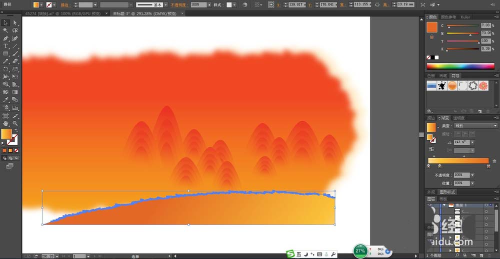 2、我们用圆形工具画出山峰的基本轮廓,再用橙黄色到白色的渐变填充,复制这个山峰成为多个,让远处山峰重叠的景象呈现出来。