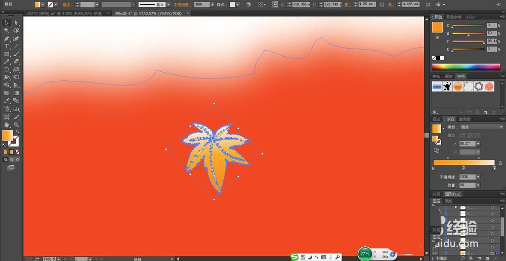 5、进一步使用钢笔绘制出一片多边形的枫叶的路径,我们用白色到橙色的渐变填充。叶片的茎杆用黄色填充。
