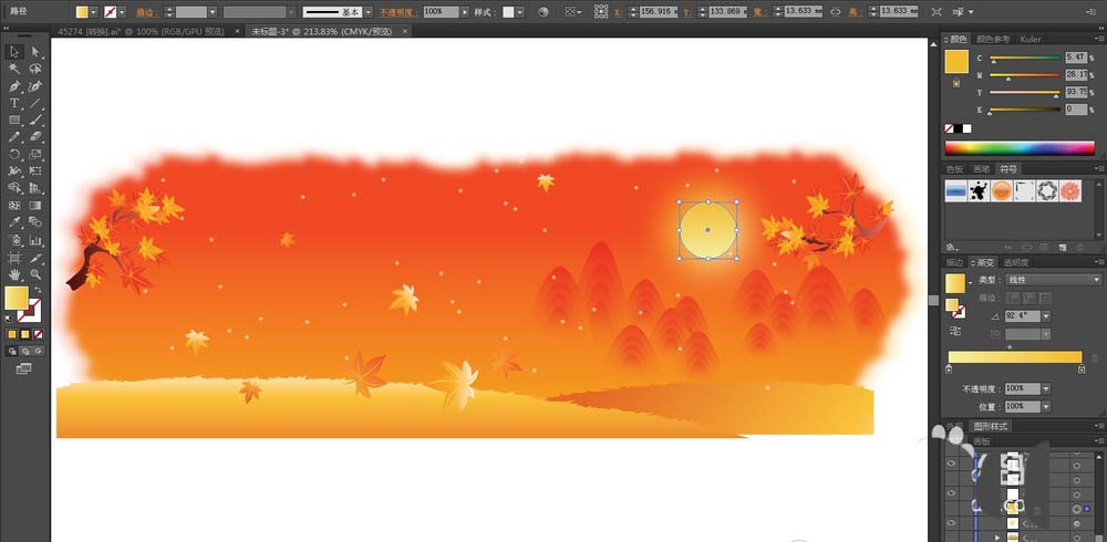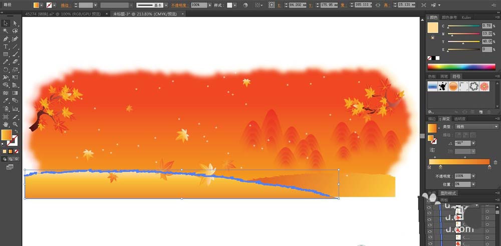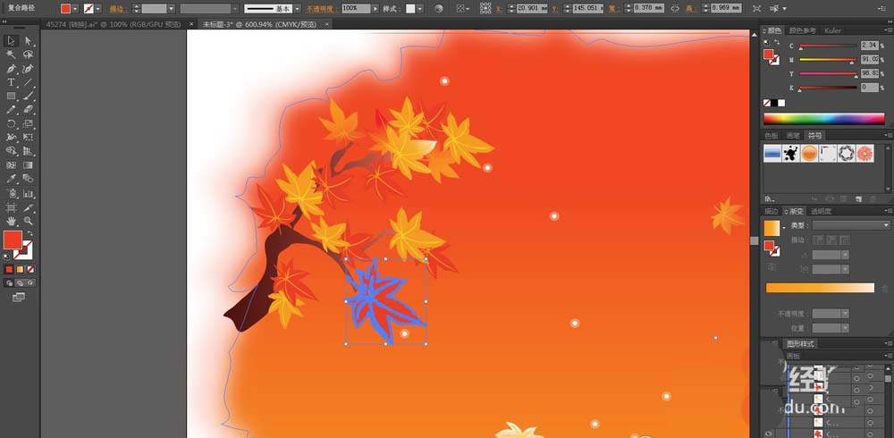 6、连续复制枫叶的路径,让其分布在整个背景的图片当中,在左右两侧画出枫叶树的枝杆并用咖啡色填充,再复制多个大小不同的枫叶在枝条上面,我们填充一部枫叶为红色的渐变,让红色枫叶与黄色枫叶交替出现。