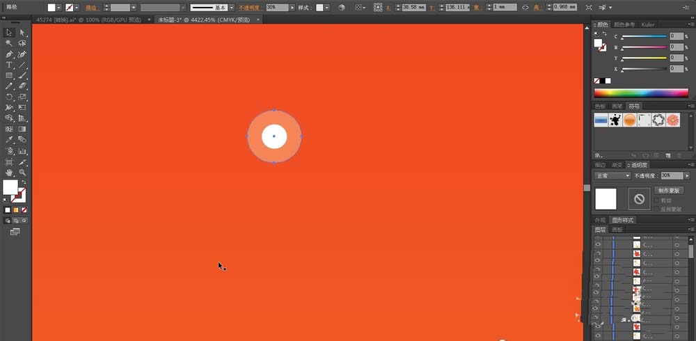 7、使用圆形工具画出圆形的装饰星星,让前面小圆为白色,后面大圆形为半透明的白色。复制这个白色的圆形到图片中更多的地方作为修饰元素。