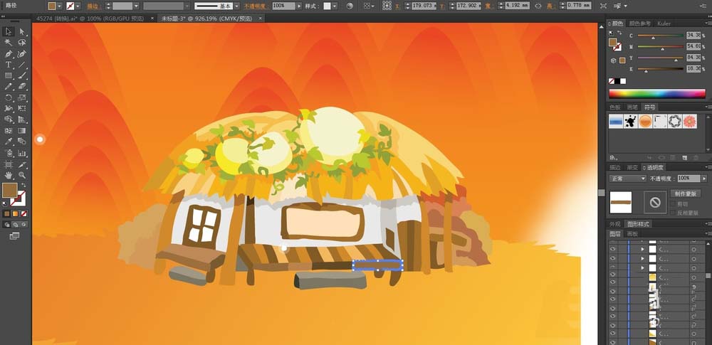 10、我们用黄色与橙色搭配填充屋顶,用淡黄色与白色搭配填充瓜果元素,用咖啡色与棕色搭配填充茅草屋前面的小木凳,完成黄昏背景设计。