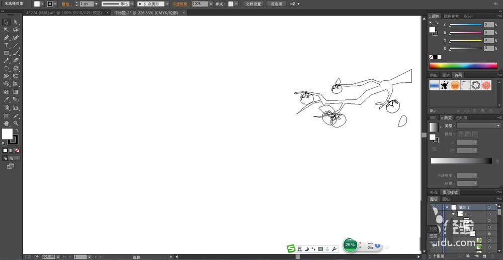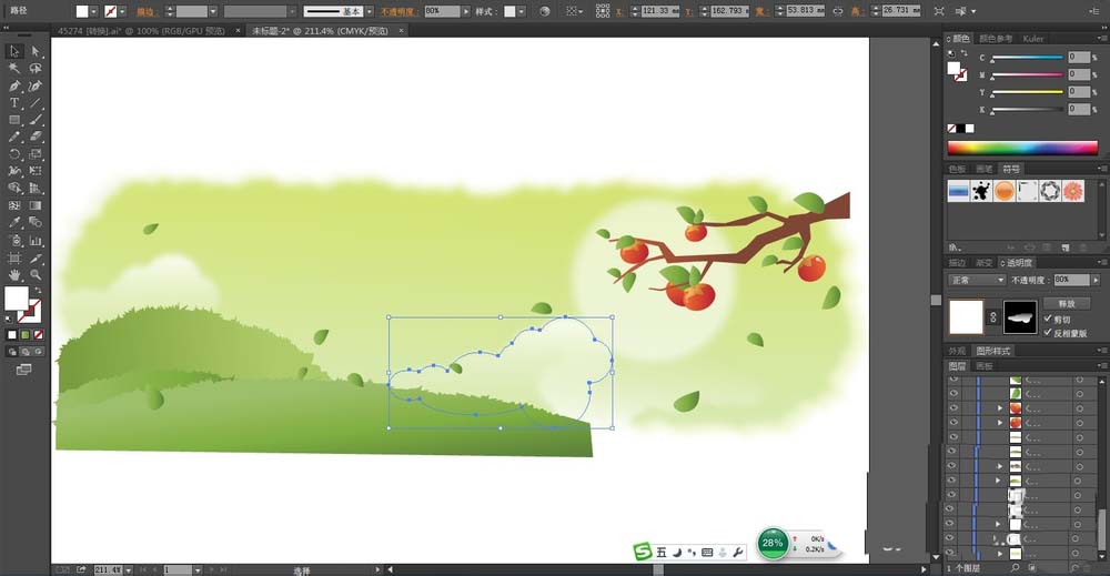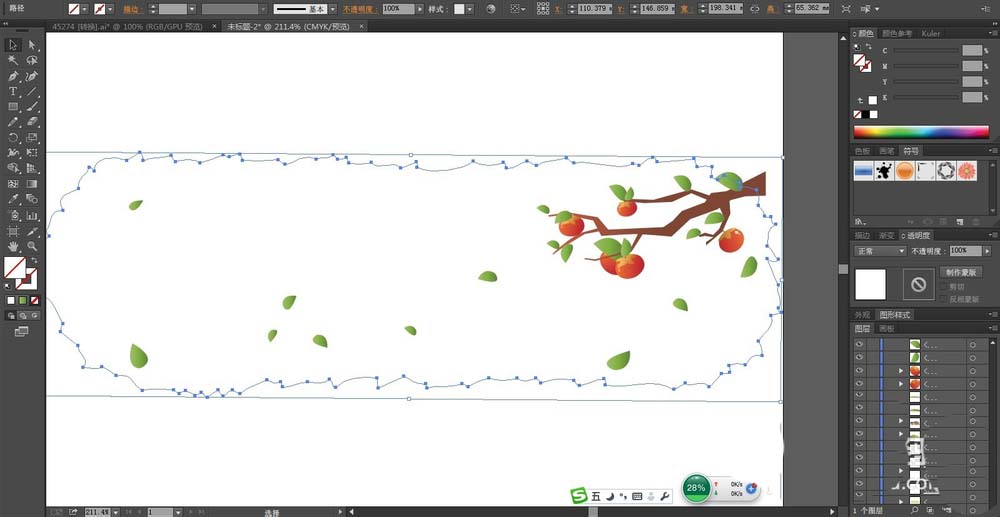 1、先用钢笔设计出背景右侧的柿子树的路径,主要元素有圆形的柿子、树叶、树枝等路径。