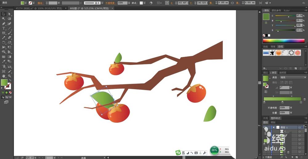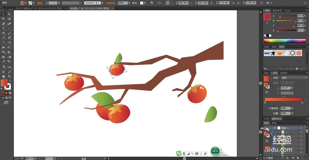 2、我们用咖啡色、橙红色、绿色的渐变分别填充树枝、柿子、绿叶等元素。在柿子的上方用橙黄色的渐变填充细节元素,暗光区域用正片叠底的设置呈现一下。